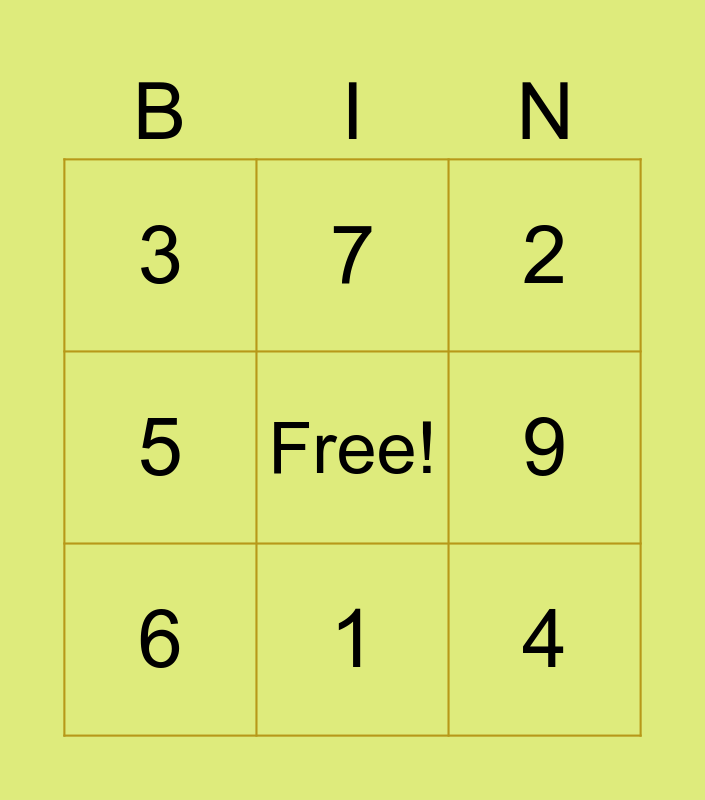 This bingo card has a free space and 10 words: 1, 2, 3, 4, 5, 6, 7, 8, 9 and 10.