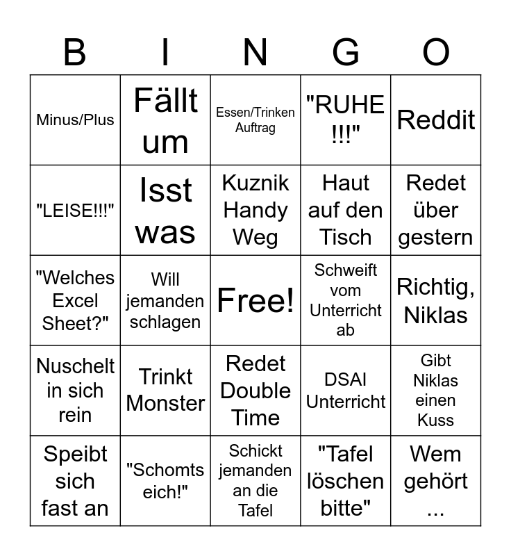 This bingo card has a free space and 29 words: Speibt sich fast an, Kommt zu spät, Will jemanden schlagen, Macht komische Geräusche, Minus/Plus, Essen/Trinken Auftrag, Isst was, Trinkt Monster, Schweift vom Unterricht ab, "Schomts eich!", Richtig, Niklas, Wem gehört ..., Schickt jemanden an die Tafel, "Tafel löschen bitte", Redet über gestern, "Ja", Redet Double Time, Nuschelt in sich rein, Reddit, "Welches Excel Sheet?", DSAI Unterricht, DBI Unterricht, Haut auf den Tisch, "LEISE!!!", "RUHE !!!", Fällt um, Gibt Niklas einen Kuss, Kuznik Handy Weg and "Laptops zu!".