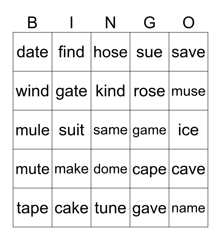 This bingo card has a free space and 24 words: make, cake, kind, tape, save, date, wind, find, game, dome, rose, mule, cape, cave, gate, gave, ice, hose, muse, suit, name, mute, sue and tune.