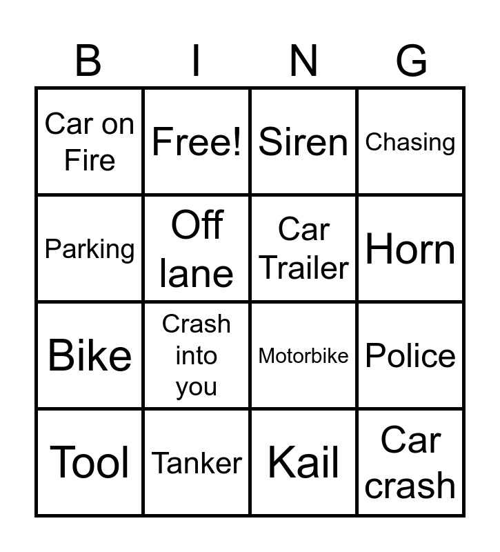 This bingo card has 16 words: Tanker, Police, Siren, Car on Fire, Bike, Free!, Motorbike, Kail, Parking, Off lane, Tool, Chasing, Crash into you, Horn, Car Trailer and Car crash.