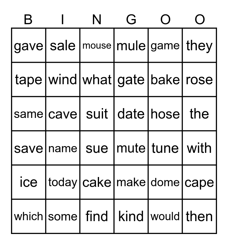 This bingo card has 36 words: make, cake, kind, tape, save, date, wind, find, game, dome, rose, mule, cape, cave, gate, gave, ice, hose, same, mouse, suit, name, mute, sue, tune, sale, bake, some, what, they, then, which, with, the, today and would.