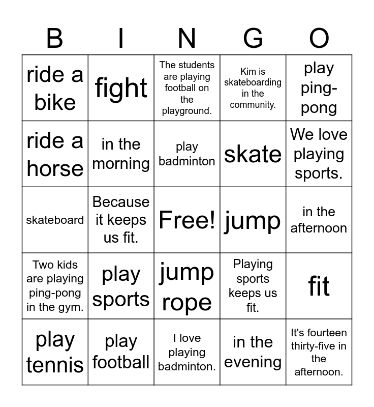 This bingo card has a free space and 24 words: play sports, play football, play badminton, play tennis, play ping-pong, ride a bike, ride a horse, fight, jump, jump rope, skate, skateboard, Playing sports keeps us fit., fit, in the morning, in the evening, in the afternoon, The students are playing football on the playground., We love playing sports., Because it keeps us fit., It's fourteen thirty-five in the afternoon., Two kids are playing ping-pong in the gym., Kim is skateboarding in the community. and I love playing badminton..