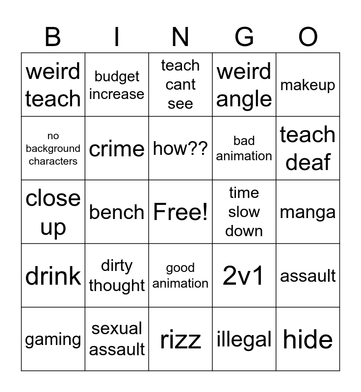 This bingo card has a free space and 24 words: dirty thought, sexual assault, how??, gaming, makeup, weird teach, no background characters, budget increase, time slow down, good animation, bad animation, close up, 2v1, assault, crime, illegal, manga, teach cant see, teach deaf, bench, hide, drink, weird angle and rizz.