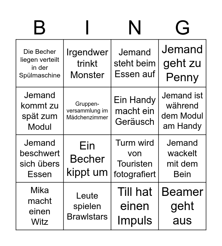 This bingo card has 16 words: Leute spielen Brawlstars, Jemand wackelt mit dem Bein, Jemand steht beim Essen auf, Die Becher liegen verteilt in der Spülmaschine, Jemand beschwert sich übers Essen, Irgendwer trinkt Monster, Turm wird von Touristen fotografiert, Till hat einen Impuls, Jemand kommt zu spät zum Modul, Gruppen-versammlung im Mädchenzimmer, Mika macht einen Witz, Jemand geht zu Penny, Ein Becher kippt um, Jemand ist während dem Modul am Handy, Ein Handy macht ein Geräusch and Beamer geht aus.