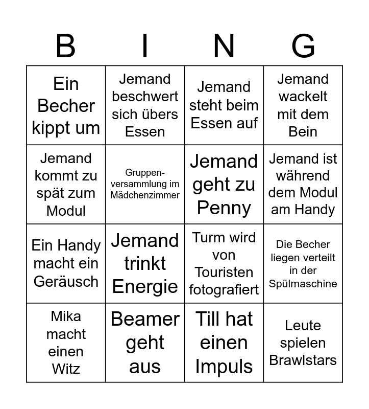 This bingo card has 16 words: Beamer geht aus, Die Becher liegen verteilt in der Spülmaschine, Jemand steht beim Essen auf, Ein Becher kippt um, Ein Handy macht ein Geräusch, Jemand beschwert sich übers Essen, Turm wird von Touristen fotografiert, Till hat einen Impuls, Jemand kommt zu spät zum Modul, Gruppen-versammlung im Mädchenzimmer, Mika macht einen Witz, Jemand wackelt mit dem Bein, Jemand trinkt Energie, Jemand ist während dem Modul am Handy, Jemand geht zu Penny and Leute spielen Brawlstars.