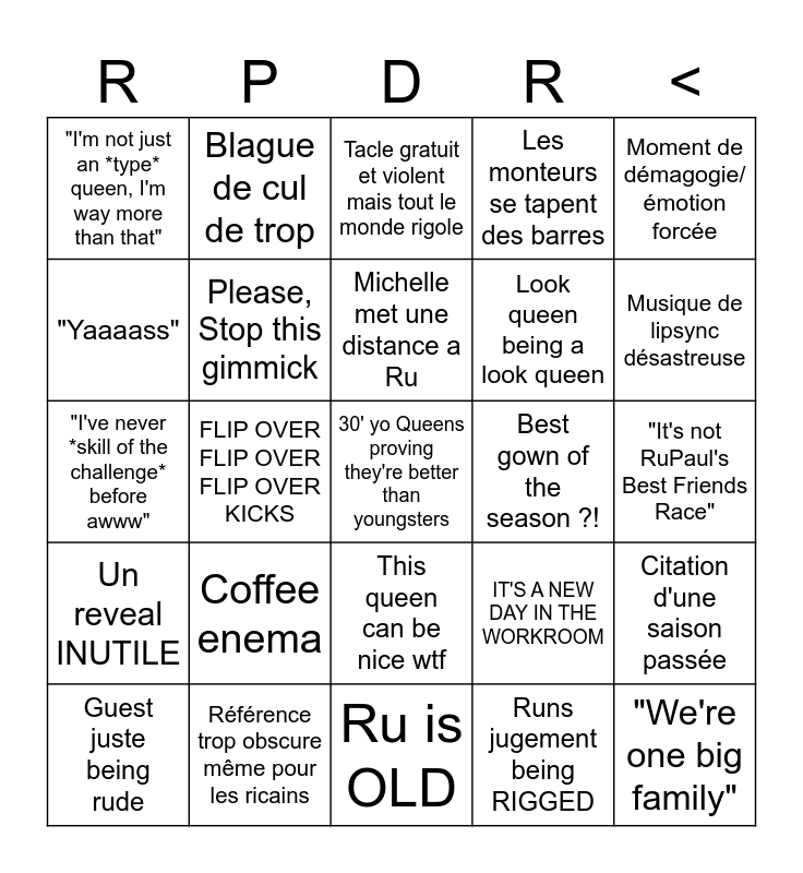 This bingo card has 25 words: Coffee enema, Ru is OLD, Michelle met une distance a Ru, Guest juste being rude, Moment de démagogie/ émotion forcée, "I'm not just an *type* queen, I'm way more than that", "Yaaaass", Blague de cul de trop, Best gown of the season ?!, This queen can be nice wtf, Look queen being a look queen, "I've never *skill of the challenge* before awww", IT'S A NEW DAY IN THE WORKROOM, Citation d'une saison passée, Please, Stop this gimmick, "We're one big family", "It's not RuPaul's Best Friends Race", Tacle gratuit et violent mais tout le monde rigole, Musique de lipsync désastreuse, FLIP OVER FLIP OVER FLIP OVER KICKS, 30' yo Queens proving they're better than youngsters, Référence trop obscure même pour les ricains, Un reveal INUTILE, Les monteurs se tapent des barres and Runs jugement being RIGGED.