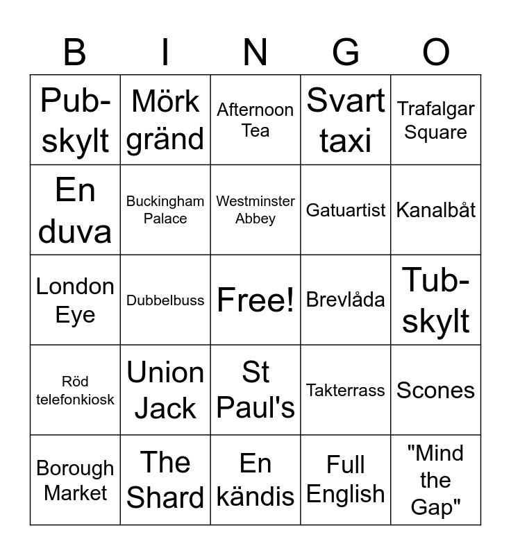 This bingo card has a free space and 40 words: Big Ben, London Eye, Tower Bridge, Buckingham Palace, The Shard, St Paul's, Westminster Abbey, Piccadilly Circus, Trafalgar Square, Röd telefonkiosk, Dubbelbuss, Svart taxi, "Mind the Gap", Tub-skylt, Brevlåda, Union Jack, En Bobby, Pub-skylt, Fish & Chips, Afternoon Tea, Scones, Full English, Gatuartist, En duva, Blå plakett, Pastellfärgat hus, Joggare, Zebra-korsning, Graffiti, En vakt, Järngrind, Borough Market, Vintagebutik, Takterrass, Kanalbåt, En kändis, Emaljskylt, Kaffemugg, Mörk gränd and Blomsterbutik.
