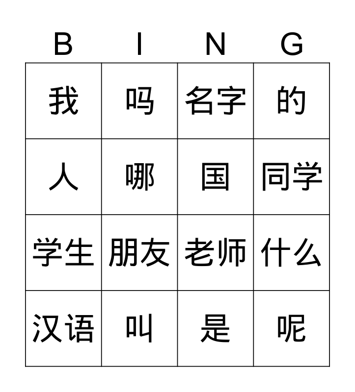 This bingo card has 16 words: 叫, 什么, 名字, 我, 学生, 吗, 老师, 是, 人, 哪, 汉语, 的, 朋友, 同学, 国 and 呢.