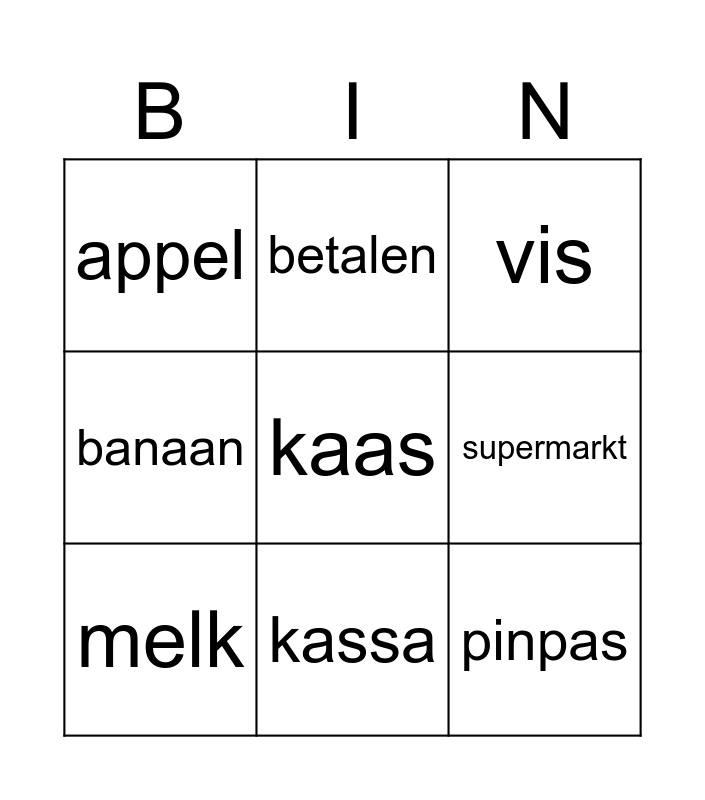 This bingo card has a free space and 17 words: vlees, boodschappen, vis, appel, kool, banaan, geld, melk, kassa, supermarkt, kool, kopen, pinpas, betalen, brood, tomaat and bon.