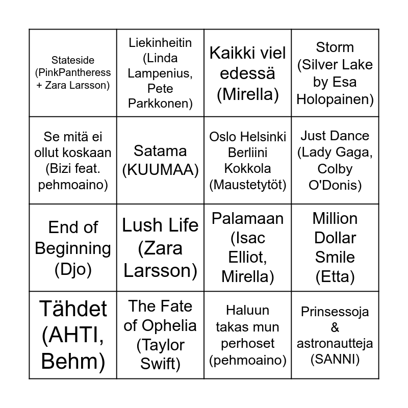 This bingo card has 20 words: Million Dollar Smile (Etta), Perhonen (Lauri Haav), Kaikki viel edessä (Mirella), Make up your mind (Mirella, Averagekidluke), Tähdet (AHTI, Behm), Se mitä ei ollut koskaan (Bizi feat. pehmoaino), The Fate of Ophelia (Taylor Swift), Stateside (PinkPantheress + Zara Larsson), End of Beginning (Djo), Liekinheitin (Linda Lampenius, Pete Parkkonen), Lush Life (Zara Larsson), Palamaan (Isac Elliot, Mirella), Satama (KUUMAA), Prinsessoja & astronautteja (SANNI), Oslo Helsinki Berliini Kokkola (Maustetytöt), Die With A Smile (Lady Gaga, Bruno Mars), Just Dance (Lady Gaga, Colby O'Donis), Storm (Silver Lake by Esa Holopainen), Haluun takas mun perhoset (pehmoaino) and Ihan kohta ohi (KUUMAA, emma & matilda).