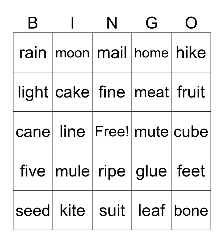This bingo card has a free space and 40 words: tape, cane, game, cake, kite, ripe, fine, lime, hike, five, line, home, bone, cube, mute, mule, June, rain, wait, mail, feet, leaf, meat, light, pie, spy, cry, happy, key, right, meat, seed, blue, glue, fruit, suit, new, dew, moon and boot.
