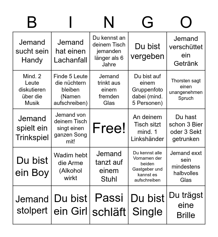This bingo card has a free space and 25 words: Wadim hebt die Arme (Alkohol wirkt, Passi schläft, Jemand trinkt aus einem fremden Glas, Jemand stolpert, Jemand verschüttet ein Getränk, Jemand sucht sein Handy, Mind. 2 Leute diskutieren über die Musik, Jemand hat einen Lachanfall, An deinem Tisch sitzt mind. 1 Linkshänder, Jemand tanzt auf einem Stuhl, Du bist auf einem Gruppenfoto dabei (mind. 5 Personen), Jemand spielt ein Trinkspiel, Du kennst alle Vornamen der beiden Gastgeber und kannst es aufschreiben, Jemand exxt sein mindestens halbvolles Glas, Finde 5 Leute die nüchtern bleiben (Namen aufschreiben), Alle am Tisch geben dir einen High-Five, Du hast schon 3 Bier oder 3 Sekt getrunken, Du kennst an deinem Tisch jemanden länger als 6 Jahre, Thorsten sagt einen unangenehmen Spruch, Jemand von deinem Tisch singt einen ganzen Song mit!, Du trägst eine Brille, Du bist ein Girl, Du bist ein Boy, Du bist vergeben and Du bist Single.