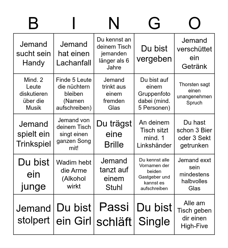 This bingo card has 25 words: Wadim hebt die Arme (Alkohol wirkt, Passi schläft, Jemand trinkt aus einem fremden Glas, Jemand stolpert, Jemand verschüttet ein Getränk, Jemand sucht sein Handy, Mind. 2 Leute diskutieren über die Musik, Jemand hat einen Lachanfall, An deinem Tisch sitzt mind. 1 Linkshänder, Jemand tanzt auf einem Stuhl, Du bist auf einem Gruppenfoto dabei (mind. 5 Personen), Jemand spielt ein Trinkspiel, Du kennst alle Vornamen der beiden Gastgeber und kannst es aufschreiben, Jemand exxt sein mindestens halbvolles Glas, Finde 5 Leute die nüchtern bleiben (Namen aufschreiben), Alle am Tisch geben dir einen High-Five, Du hast schon 3 Bier oder 3 Sekt getrunken, Du kennst an deinem Tisch jemanden länger als 6 Jahre, Thorsten sagt einen unangenehmen Spruch, Jemand von deinem Tisch singt einen ganzen Song mit!, Du trägst eine Brille, Du bist ein Girl, Du bist ein junge, Du bist vergeben and Du bist Single.