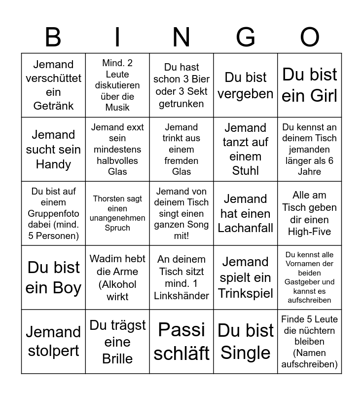 This bingo card has 25 words: Wadim hebt die Arme (Alkohol wirkt, Passi schläft, Jemand trinkt aus einem fremden Glas, Jemand stolpert, Du bist ein Girl, Jemand verschüttet ein Getränk, Jemand sucht sein Handy, Mind. 2 Leute diskutieren über die Musik, Jemand hat einen Lachanfall, An deinem Tisch sitzt mind. 1 Linkshänder, Jemand tanzt auf einem Stuhl, Du bist auf einem Gruppenfoto dabei (mind. 5 Personen), Jemand spielt ein Trinkspiel, Du kennst alle Vornamen der beiden Gastgeber und kannst es aufschreiben, Jemand exxt sein mindestens halbvolles Glas, Finde 5 Leute die nüchtern bleiben (Namen aufschreiben), Alle am Tisch geben dir einen High-Five, Du hast schon 3 Bier oder 3 Sekt getrunken, Du kennst an deinem Tisch jemanden länger als 6 Jahre, Thorsten sagt einen unangenehmen Spruch, Jemand von deinem Tisch singt einen ganzen Song mit!, Du trägst eine Brille, Du bist ein Boy, Du bist vergeben and Du bist Single.