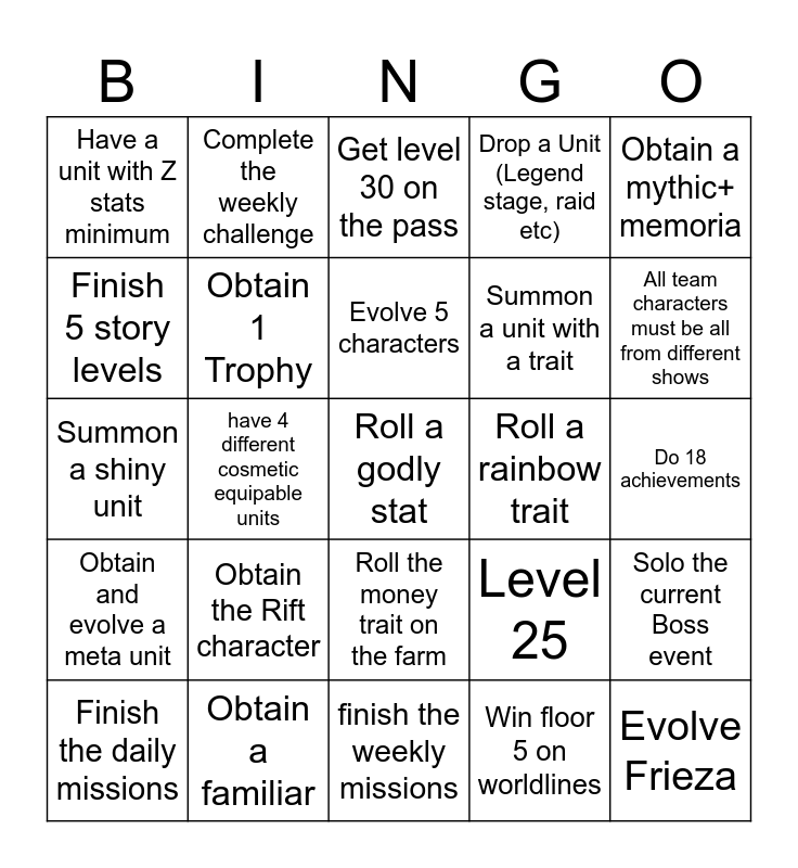 This bingo card has a free space and 24 words: Obtain the Rift character, Obtain a familiar, Evolve 5 characters, Finish the daily missions, Obtain a mythic+ memoria, Have a unit with Z stats minimum, Finish 5 story levels, Complete the weekly challenge, Roll a rainbow trait, Roll the money trait on the farm, Summon a unit with a trait, Summon a shiny unit, Level 25, Solo the current Boss event, Obtain 1 Trophy, Win floor 5 on worldlines, Do 18 achievements, Get level 30 on the pass, All team characters must be all from different shows, have 4 different cosmetic equipable units, Evolve Frieza, Obtain and evolve a meta unit, Drop a Unit (Legend stage, raid etc) and finish the weekly missions.
