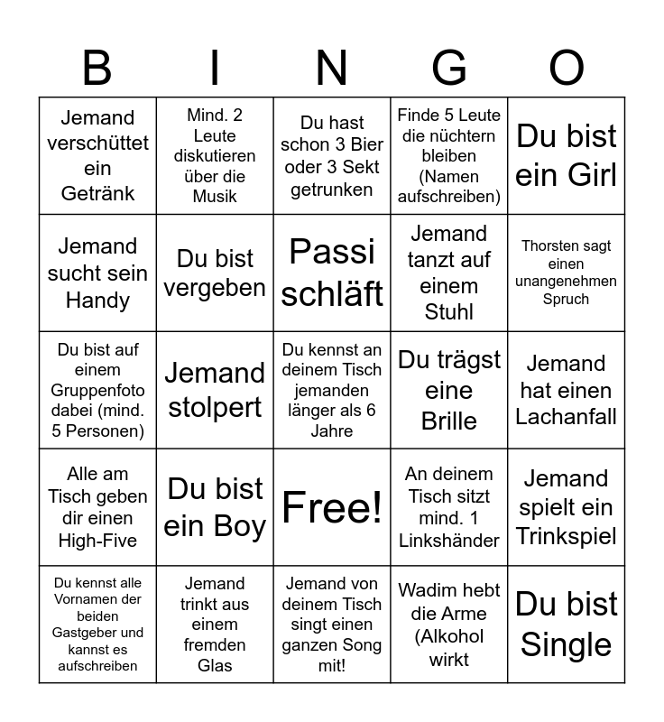 This bingo card has 26 words: Free!, Wadim hebt die Arme (Alkohol wirkt, Passi schläft, Jemand trinkt aus einem fremden Glas, Du bist ein Girl, Jemand verschüttet ein Getränk, Jemand sucht sein Handy, Mind. 2 Leute diskutieren über die Musik, Jemand hat einen Lachanfall, An deinem Tisch sitzt mind. 1 Linkshänder, Jemand tanzt auf einem Stuhl, Du bist auf einem Gruppenfoto dabei (mind. 5 Personen), Jemand spielt ein Trinkspiel, Du kennst alle Vornamen der beiden Gastgeber und kannst es aufschreiben, Jemand stolpert, Jemand exxt sein mindestens halbvolles Glas, Finde 5 Leute die nüchtern bleiben (Namen aufschreiben), Alle am Tisch geben dir einen High-Five, Du hast schon 3 Bier oder 3 Sekt getrunken, Du kennst an deinem Tisch jemanden länger als 6 Jahre, Thorsten sagt einen unangenehmen Spruch, Jemand von deinem Tisch singt einen ganzen Song mit!, Du trägst eine Brille, Du bist ein Boy, Du bist vergeben and Du bist Single.