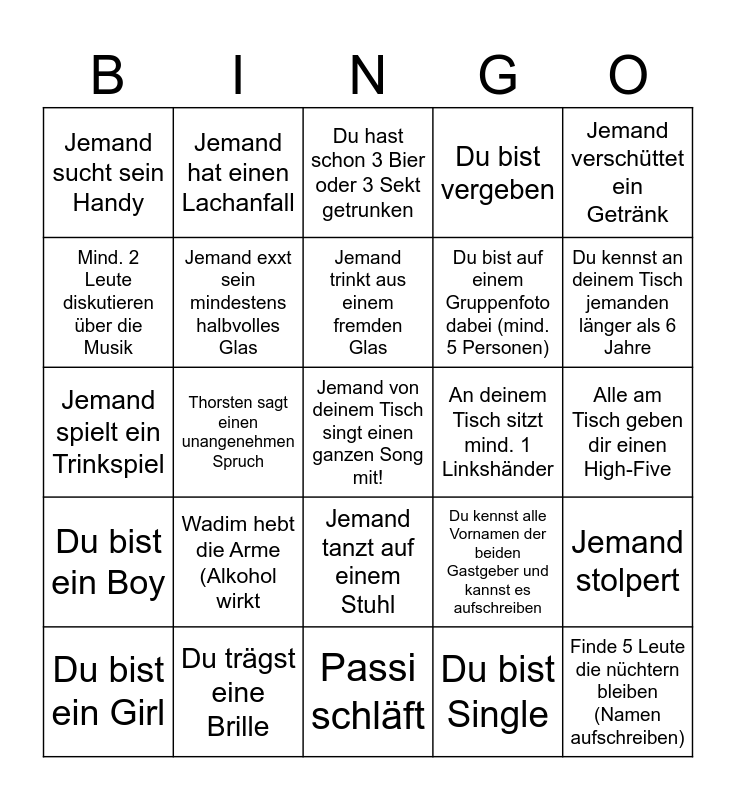 This bingo card has 25 words: Wadim hebt die Arme (Alkohol wirkt, Passi schläft, Jemand trinkt aus einem fremden Glas, Du bist ein Girl, Jemand verschüttet ein Getränk, Jemand sucht sein Handy, Mind. 2 Leute diskutieren über die Musik, Jemand hat einen Lachanfall, An deinem Tisch sitzt mind. 1 Linkshänder, Jemand tanzt auf einem Stuhl, Du bist auf einem Gruppenfoto dabei (mind. 5 Personen), Jemand spielt ein Trinkspiel, Du kennst alle Vornamen der beiden Gastgeber und kannst es aufschreiben, Jemand stolpert, Jemand exxt sein mindestens halbvolles Glas, Finde 5 Leute die nüchtern bleiben (Namen aufschreiben), Alle am Tisch geben dir einen High-Five, Du hast schon 3 Bier oder 3 Sekt getrunken, Du kennst an deinem Tisch jemanden länger als 6 Jahre, Thorsten sagt einen unangenehmen Spruch, Jemand von deinem Tisch singt einen ganzen Song mit!, Du trägst eine Brille, Du bist ein Boy, Du bist vergeben and Du bist Single.