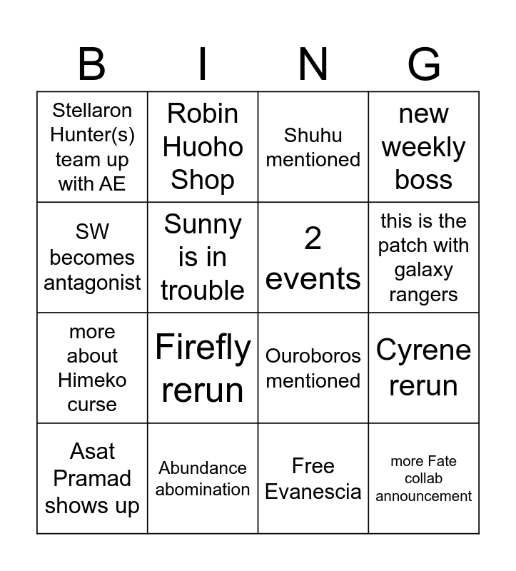This bingo card has 16 words: Abundance abomination, Cyrene rerun, Shuhu mentioned, Stellaron Hunter(s) team up with AE, more about Himeko curse, Robin Huoho Shop, Ouroboros mentioned, Free Evanescia, SW becomes antagonist, Sunny is in trouble, Asat Pramad shows up, new weekly boss, Firefly rerun, this is the patch with galaxy rangers, 2 events and more Fate collab announcement.