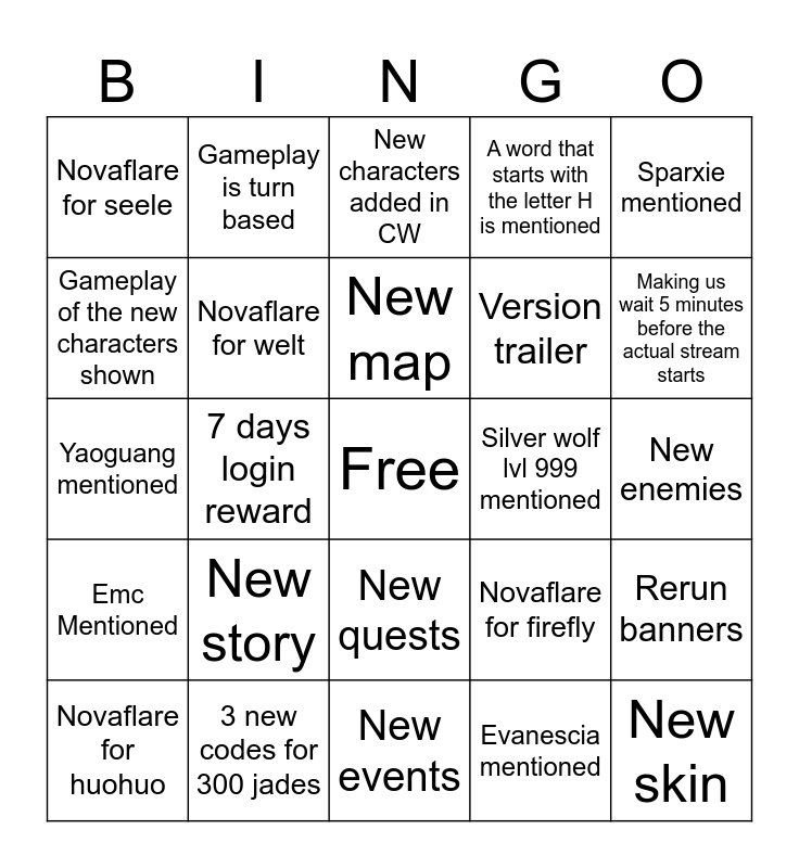 This bingo card has a free space and 24 words: New story, 3 new codes for 300 jades, New map, Novaflare for huohuo, Sparxie mentioned, Novaflare for seele, Gameplay of the new characters shown, Gameplay is turn based, Silver wolf lvl 999 mentioned, New quests, Version trailer, Yaoguang mentioned, Novaflare for firefly, Rerun banners, Novaflare for welt, Evanescia mentioned, New enemies, New characters added in CW, Making us wait 5 minutes before the actual stream starts, 7 days login reward, New skin, Emc Mentioned, A word that starts with the letter H is mentioned and New events.