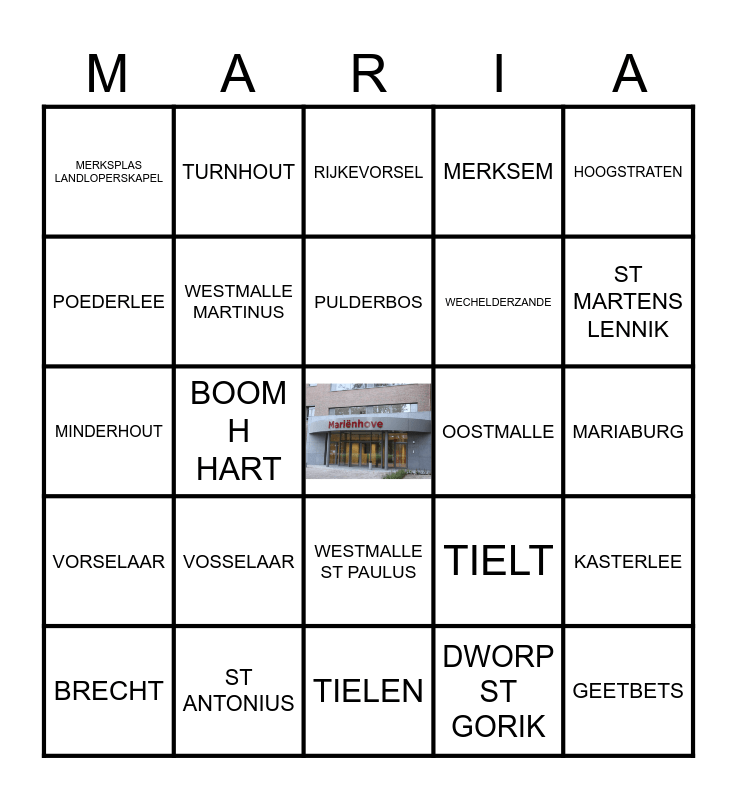 This bingo card has a free space and 30 words: ST ANTONIUS, PAMEL, BOOM H HART, ZOERSEL ST ELISABETH, MERKSPLAS LANDLOPERSKAPEL, RIJKEVORSEL, WESTMALLE MARTINUS, WESTMALLE ST PAULUS, OOSTMALLE, TIELEN, MARIABURG, GEETBETS, DWORP ST GORIK, POPPEL, ST MARTENS LENNIK, TER HAGEN, TIELT, VORSELAAR, VOSSELAAR, HOOGSTRATEN, MINDERHOUT, HEIST O/D BERG, TURNHOUT, WECHELDERZANDE, POEDERLEE, MERKSEM, KASTERLEE, BRECHT, PULDERBOS and WUUSTWEZEL.