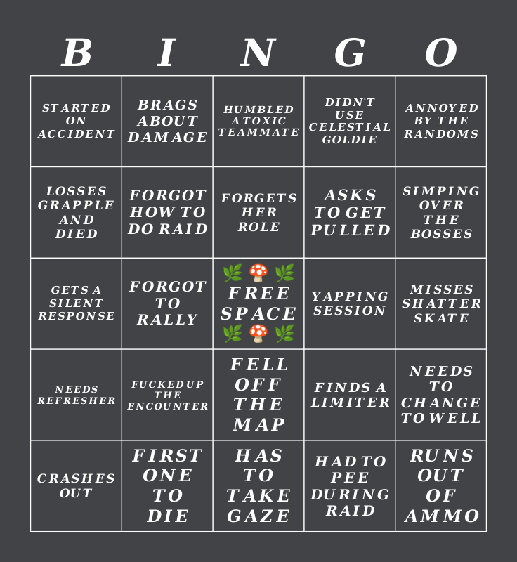 This bingo card has a free space and 29 words: 𝑪𝑹𝑨𝑺𝑯𝑬𝑺 𝑶𝑼𝑻, 𝑴𝑰𝑺𝑺𝑬𝑫 𝑮𝑶𝑳𝑫𝑬𝑵 𝑮𝑼𝑵, 𝑭𝑶𝑹𝑮𝑶𝑻 𝑻𝑶 𝑹𝑨𝑳𝑳𝒀, 𝑯𝑨𝑫 𝑻𝑯𝑬 𝑳𝑬𝑨𝑺𝑻 𝑫𝑨𝑴𝑨𝑮𝑬, 𝑺𝑻𝑨𝑹𝑻𝑬𝑫 𝑶𝑵 𝑨𝑪𝑪𝑰𝑫𝑬𝑵𝑻, 𝑯𝑼𝑴𝑩𝑳𝑬𝑫 𝑨 𝑻𝑶𝑿𝑰𝑪 𝑻𝑬𝑨𝑴𝑴𝑨𝑻𝑬, 𝑭𝑶𝑹𝑮𝑶𝑻 𝑯𝑶𝑾 𝑻𝑶 𝑫𝑶 𝑹𝑨𝑰𝑫, 𝑭𝑼𝑪𝑲𝑬𝑫 𝑼𝑷 𝑻𝑯𝑬 𝑬𝑵𝑪𝑶𝑼𝑵𝑻𝑬𝑹, 𝒀𝑨𝑷𝑷𝑰𝑵𝑮 𝑺𝑬𝑺𝑺𝑰𝑶𝑵, 𝑭𝑰𝑹𝑺𝑻 𝑶𝑵𝑬 𝑻𝑶 𝑫𝑰𝑬, 𝑴𝑰𝑺𝑺𝑬𝑺 𝑺𝑯𝑨𝑻𝑻𝑬𝑹 𝑺𝑲𝑨𝑻𝑬, 𝑹𝑼𝑵𝑺 𝑶𝑼𝑻 𝑶𝑭 𝑨𝑴𝑴𝑶, 𝑯𝑨𝑺 𝑻𝑶 𝑻𝑨𝑲𝑬 𝑮𝑨𝒁𝑬, 𝑯𝑨𝑫 𝑻𝑶 𝑷𝑬𝑬 𝑫𝑼𝑹𝑰𝑵𝑮 𝑹𝑨𝑰𝑫, 𝑺𝑰𝑴𝑷𝑰𝑵𝑮 𝑶𝑽𝑬𝑹 𝑻𝑯𝑬 𝑩𝑶𝑺𝑺𝑬𝑺, 𝑺𝑻𝑼𝑻𝑻𝑬𝑹𝑺 𝑶𝑽𝑬𝑹 𝑯𝑬𝑹 𝑾𝑶𝑹𝑫𝑺, 𝑭𝑬𝑳𝑳 𝑶𝑭𝑭 𝑻𝑯𝑬 𝑴𝑨𝑷, 𝑵𝑬𝑬𝑫𝑺 𝑹𝑬𝑭𝑹𝑬𝑺𝑯𝑬𝑹, 𝑨𝑵𝑵𝑶𝒀𝑬𝑫 𝑩𝒀 𝑻𝑯𝑬 𝑹𝑨𝑵𝑫𝑶𝑴𝑺, 𝑮𝑬𝑻𝑺 𝑨 𝑺𝑰𝑳𝑬𝑵𝑻 𝑹𝑬𝑺𝑷𝑶𝑵𝑺𝑬, 𝑭𝑰𝑵𝑫𝑺 𝑨 𝑳𝑰𝑴𝑰𝑻𝑬𝑹, 𝑴𝑼𝑻𝑬𝑫 𝑶𝑵 𝑨𝑪𝑪𝑰𝑫𝑬𝑵𝑻, 𝑨𝑺𝑲𝑺 𝑻𝑶 𝑮𝑬𝑻 𝑷𝑼𝑳𝑳𝑬𝑫, 𝑳𝑶𝑺𝑺𝑬𝑺 𝑮𝑹𝑨𝑷𝑷𝑳𝑬 𝑨𝑵𝑫 𝑫𝑰𝑬𝑫, 𝑫𝑰𝑫𝑵'𝑻 𝑼𝑺𝑬 𝑪𝑬𝑳𝑬𝑺𝑻𝑰𝑨𝑳 𝑮𝑶𝑳𝑫𝑰𝑬, 𝑩𝑹𝑨𝑮𝑺 𝑨𝑩𝑶𝑼𝑻 𝑫𝑨𝑴𝑨𝑮𝑬, 𝑵𝑬𝑬𝑫𝑺 𝑻𝑶 𝑪𝑯𝑨𝑵𝑮𝑬 𝑻𝑶 𝑾𝑬𝑳𝑳, 𝑭𝑶𝑹𝑮𝑬𝑻𝑺 𝑯𝑬𝑹 𝑹𝑶𝑳𝑬 and 𝑻𝑶𝑶 𝑳𝑨𝑻𝑬 𝑶𝑵 𝑹𝑨𝑰𝑫 𝑴𝑬𝑪𝑯𝑨𝑵𝑰𝑪𝑺.