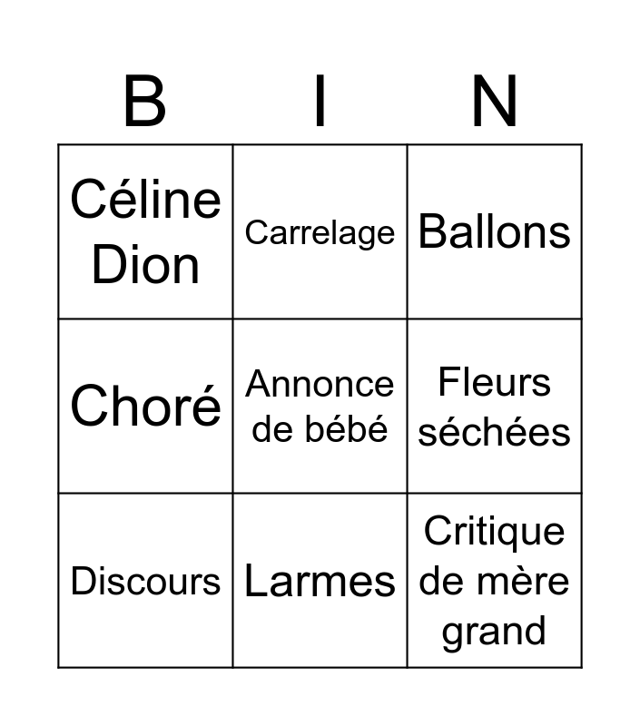 This bingo card has a free space and 8 words: Fleurs séchées, Ballons, Carrelage, Discours, Céline Dion, Critique de mère grand, Choré and Larmes.