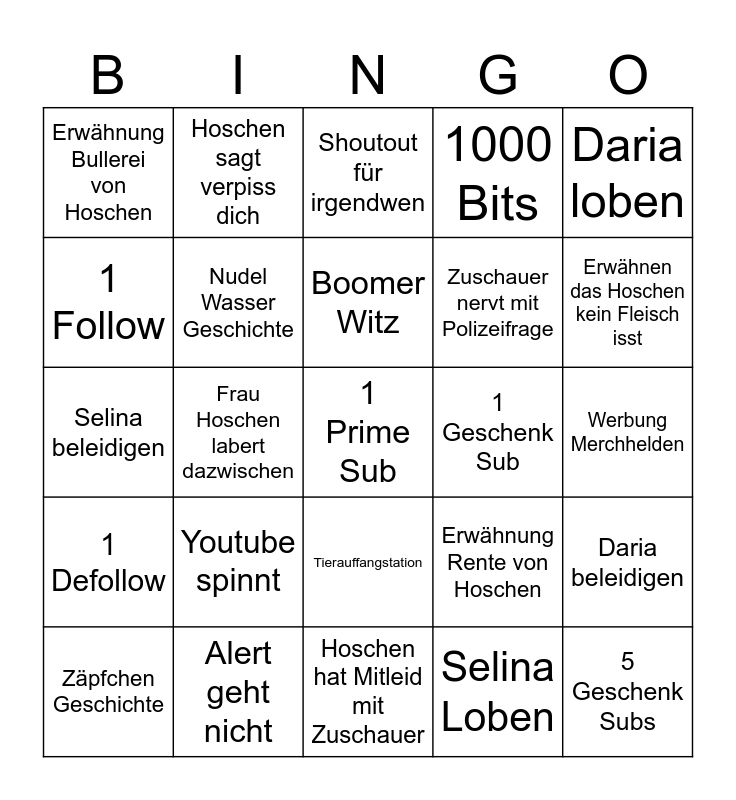 This bingo card has a free space and 24 words: Youtube spinnt, Alert geht nicht, Boomer Witz, Zäpfchen Geschichte, Daria loben, Erwähnung Bullerei von Hoschen, 1 Follow, Hoschen sagt verpiss dich, 1 Geschenk Sub, Tierauffangstation, Zuschauer nervt mit Polizeifrage, Selina beleidigen, Erwähnung Rente von Hoschen, Daria beleidigen, Nudel Wasser Geschichte, Selina Loben, Werbung Merchhelden, Shoutout für irgendwen, Erwähnen das Hoschen kein Fleisch isst, Frau Hoschen labert dazwischen, 5 Geschenk Subs, 1 Defollow, 1000 Bits and Hoschen hat Mitleid mit Zuschauer.