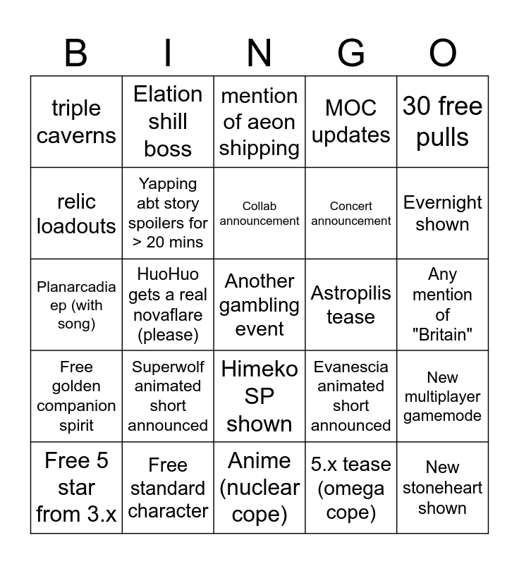 This bingo card has 25 words: Superwolf animated short announced, Anime (nuclear cope), Collab announcement, Free 5 star from 3.x, 30 free pulls, triple caverns, relic loadouts, Elation shill boss, Astropilis tease, Himeko SP shown, Concert announcement, Planarcadia ep (with song), Evanescia animated short announced, New multiplayer gamemode, Yapping abt story spoilers for > 20 mins, New stoneheart shown, Any mention of "Britain", mention of aeon shipping, Evernight shown, HuoHuo gets a real novaflare (please), Another gambling event, Free standard character, Free golden companion spirit, MOC updates and 5.x tease (omega cope).