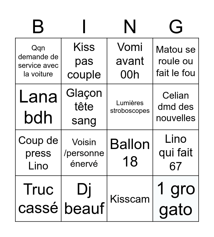 This bingo card has 16 words: Dj beauf, Lino qui fait 67, Vomi avant 00h, Qqn demande de service avec la voiture, Coup de press Lino, Kiss pas couple, Ballon 18, Kisscam, Lana bdh, Glaçon tête sang, Truc cassé, Matou se roule ou fait le fou, Voisin /personne énervé, Celian dmd des nouvelles, Lumières stroboscopes and 1 gro gato.