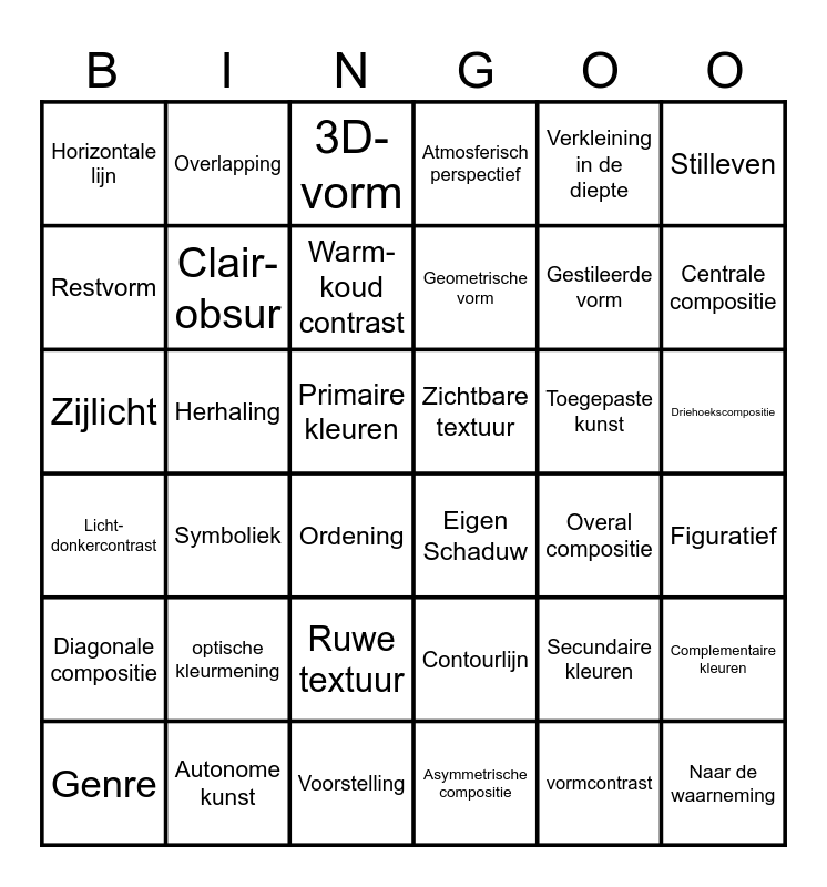 This bingo card has 36 words: Contourlijn, Ruwe textuur, Asymmetrische compositie, Restvorm, Licht-donkercontrast, Zichtbare textuur, Clair-obsur, Voorstelling, Verkleining in de diepte, Secundaire kleuren, Centrale compositie, Atmosferisch perspectief, Complementaire kleuren, Herhaling, Geometrische vorm, Horizontale lijn, Diagonale compositie, Toegepaste kunst, Zijlicht, 3D-vorm, Primaire kleuren, Symboliek, Eigen Schaduw, Ordening, Overal compositie, Overlapping, Gestileerde vorm, Autonome kunst, Warm-koud contrast, Stilleven, Naar de waarneming, Genre, Figuratief, Driehoekscompositie, optische kleurmening and vormcontrast.