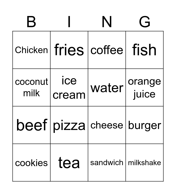 This bingo card has 16 words: tea, burger, coffee, Chicken, beef, fries, cheese, sandwich, coconut milk, ice cream, cookies, fish, pizza, orange juice, water and milkshake.
