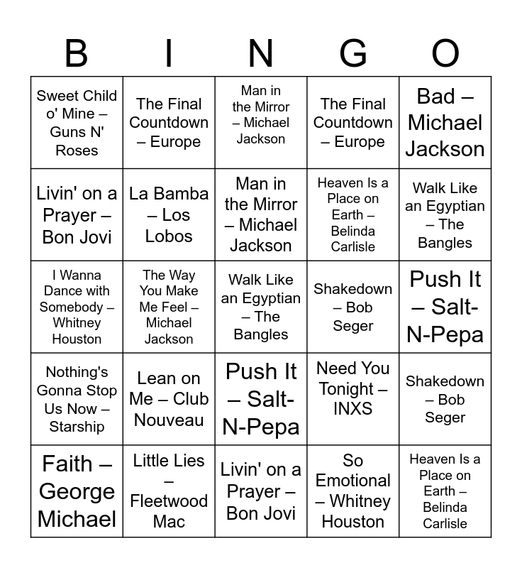 ⚠ This card has duplicate items: Never Gonna Give You Up – Rick Astley (2), Faith – George Michael (2), With or Without You – U2 (2), Sweet Child o' Mine – Guns N' Roses (2), Livin' on a Prayer – Bon Jovi (2), I Wanna Dance with Somebody – Whitney Houston (2), La Bamba – Los Lobos (2), Nothing's Gonna Stop Us Now – Starship (2), Heaven Is a Place on Earth – Belinda Carlisle (2), Here I Go Again – Whitesnake (2), The Final Countdown – Europe (2), It's a Sin – Pet Shop Boys (2), Don't Dream It's Over – Crowded House (2), Alone – Heart (2), Lean on Me – Club Nouveau (2), Little Lies – Fleetwood Mac (2), Bad – Michael Jackson (2), The Way You Make Me Feel – Michael Jackson (2), I Think We're Alone Now – Tiffany (2), Walk Like an Egyptian – The Bangles (2), Shakedown – Bob Seger (3), Man in the Mirror – Michael Jackson (2), So Emotional – Whitney Houston (2), Need You Tonight – INXS (2), Push It – Salt-N-Pepa (2)