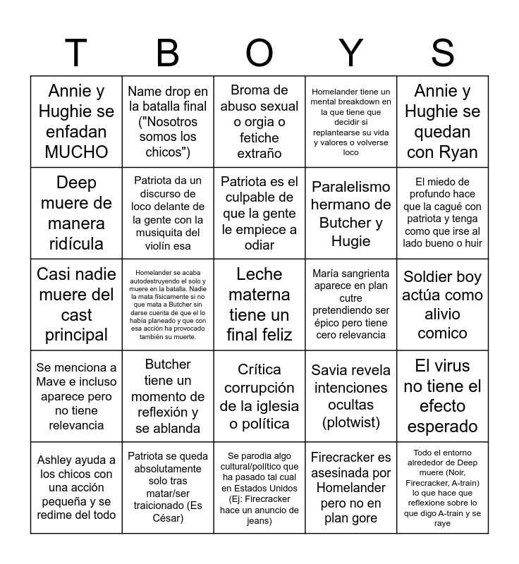 This bingo card has a free space and 24 words: Butcher tiene un momento de reflexión y se ablanda, Patriota se queda absolutamente solo tras matar/ser traicionado (Es César), Patriota es el culpable de que la gente le empiece a odiar, Ashley ayuda a los chicos con una acción pequeña y se redime del todo, Annie y Hughie se quedan con Ryan, Annie y Hughie se enfadan MUCHO, Deep muere de manera ridícula, Name drop en la batalla final ("Nosotros somos los chicos"), María sangrienta aparece en plan cutre pretendiendo ser épico pero tiene cero relevancia, Crítica corrupción de la iglesia o política, Paralelismo hermano de Butcher y Hugie, Casi nadie muere del cast principal, Savia revela intenciones ocultas (plotwist), El virus no tiene el efecto esperado, Patriota da un discurso de loco delante de la gente con la musiquita del violín esa, Firecracker es asesinada por Homelander pero no en plan gore, Soldier boy actúa como alivio comico, Broma de abuso sexual o orgia o fetiche extraño, El miedo de profundo hace que la cagué con patriota y tenga como que irse al lado bueno o huir, Homelander se acaba autodestruyendo el solo y muere en la batalla. Nadie la mata físicamente si no que mata a Butcher sin darse cuenta de que el lo había planeado y que con esa acción ha provocado también su muerte., Todo el entorno alrededor de Deep muere (Noir, Firecracker, A-train) lo que hace que reflexione sobre lo que digo A-train y se raye, Se menciona a Mave e incluso aparece pero no tiene relevancia, Homelander tiene un mental breakdown en la que tiene que decidir si replantearse su vida y valores o volverse loco and Se parodia algo cultural/político que ha pasado tal cual en Estados Unidos (Ej: Firecracker hace un anuncio de jeans).