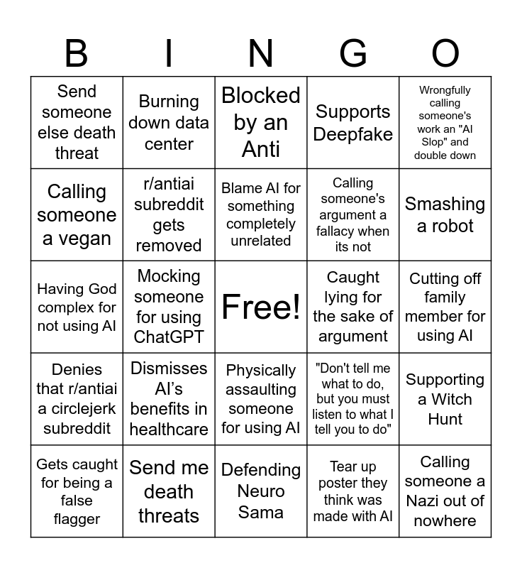 This bingo card has a free space and 24 words: Dismisses AI’s benefits in healthcare, Send me death threats, Blame AI for something completely unrelated, Gets caught for being a false flagger, Wrongfully calling someone's work an "AI Slop" and double down, Send someone else death threat, Calling someone a vegan, Burning down data center, Caught lying for the sake of argument, Physically assaulting someone for using AI, Calling someone's argument a fallacy when its not, Having God complex for not using AI, "Don't tell me what to do, but you must listen to what I tell you to do", Supporting a Witch Hunt, r/antiai subreddit gets removed, Tear up poster they think was made with AI, Cutting off family member for using AI, Blocked by an Anti, Smashing a robot, Mocking someone for using ChatGPT, Calling someone a Nazi out of nowhere, Denies that r/antiai a circlejerk subreddit, Supports Deepfake and Defending Neuro Sama.