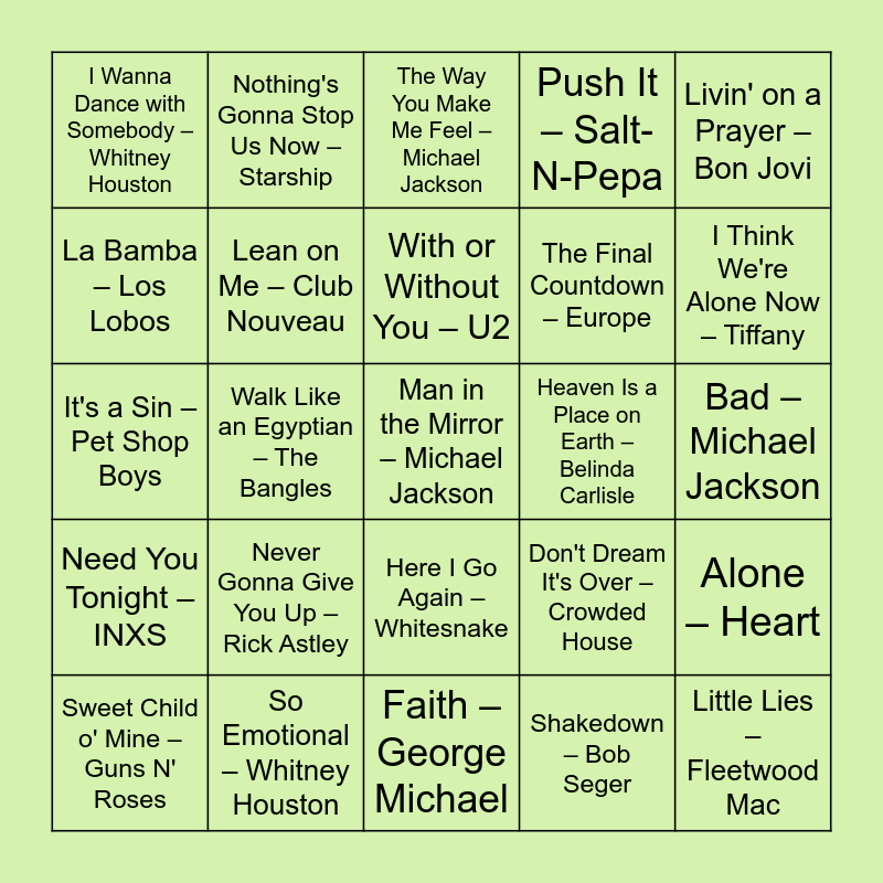 This bingo card has 25 words: Never Gonna Give You Up – Rick Astley, Faith – George Michael, With or Without You – U2, Sweet Child o' Mine – Guns N' Roses, Livin' on a Prayer – Bon Jovi, I Wanna Dance with Somebody – Whitney Houston, La Bamba – Los Lobos, Nothing's Gonna Stop Us Now – Starship, Heaven Is a Place on Earth – Belinda Carlisle, Here I Go Again – Whitesnake, The Final Countdown – Europe, It's a Sin – Pet Shop Boys, Don't Dream It's Over – Crowded House, Alone – Heart, Lean on Me – Club Nouveau, Little Lies – Fleetwood Mac, Bad – Michael Jackson, The Way You Make Me Feel – Michael Jackson, I Think We're Alone Now – Tiffany, Walk Like an Egyptian – The Bangles, Man in the Mirror – Michael Jackson, So Emotional – Whitney Houston, Need You Tonight – INXS, Push It – Salt-N-Pepa and Shakedown – Bob Seger.