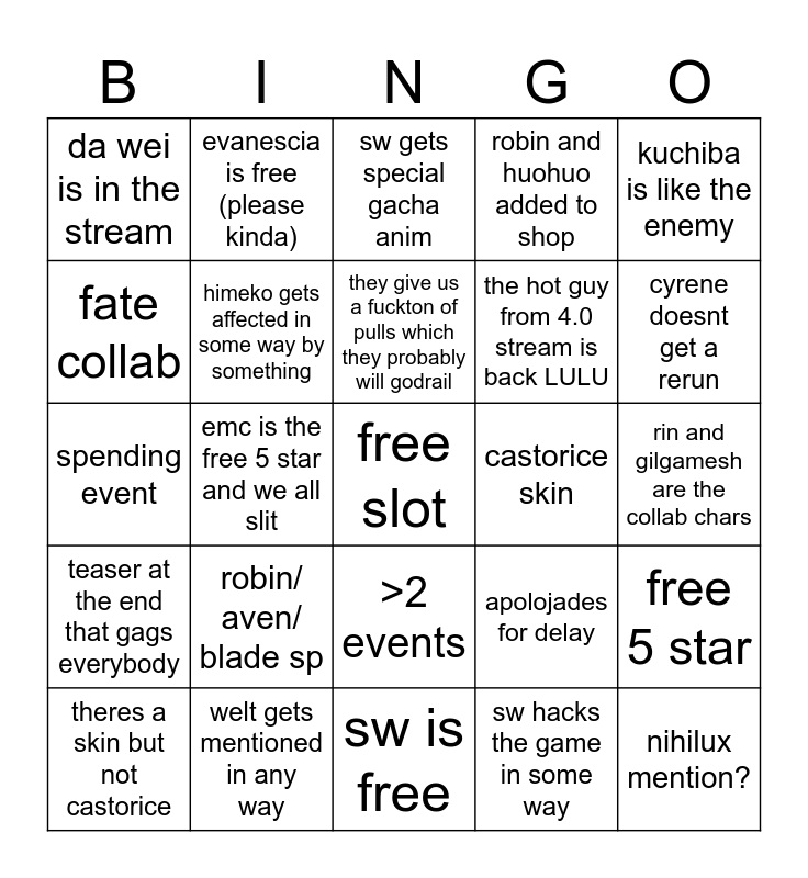 This bingo card has a free space and 24 words: robin/ aven/ blade sp, welt gets mentioned in any way, they give us a fuckton of pulls which they probably will godrail, theres a skin but not castorice, kuchiba is like the enemy, da wei is in the stream, fate collab, evanescia is free (please kinda), castorice skin, >2 events, the hot guy from 4.0 stream is back LULU, spending event, apolojades for delay, free 5 star, himeko gets affected in some way by something, sw hacks the game in some way, rin and gilgamesh are the collab chars, sw gets special gacha anim, cyrene doesnt get a rerun, emc is the free 5 star and we all slit, nihilux mention?, teaser at the end that gags everybody, robin and huohuo added to shop and sw is free.