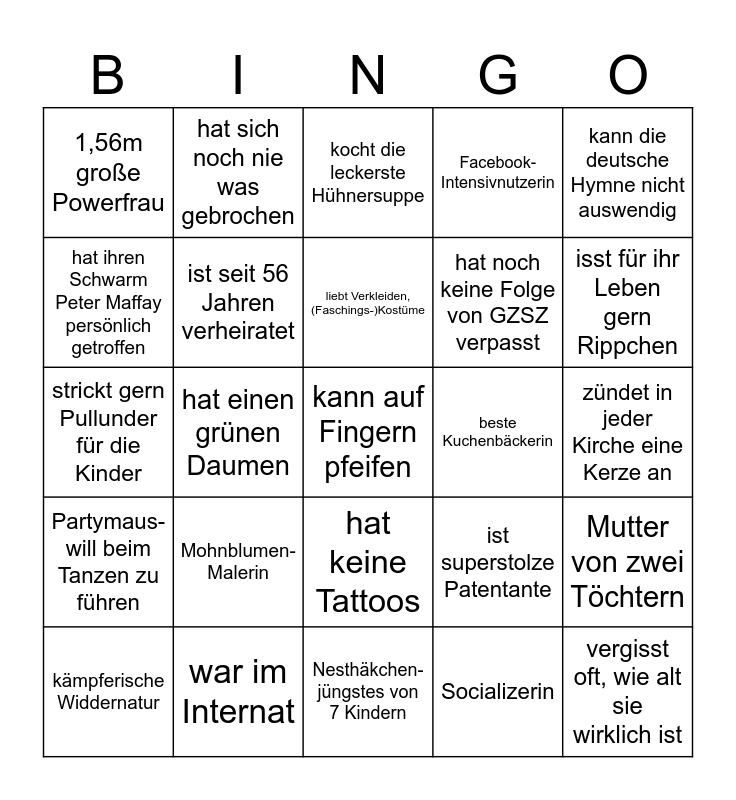 This bingo card has 25 words: Mohnblumen- Malerin, Nesthäkchen- jüngstes von 7 Kindern, liebt Verkleiden, (Faschings-)Kostüme, kämpferische Widdernatur, kann die deutsche Hymne nicht auswendig, 1,56m große Powerfrau, hat ihren Schwarm Peter Maffay persönlich getroffen, hat sich noch nie was gebrochen, beste Kuchenbäckerin, hat keine Tattoos, hat noch keine Folge von GZSZ verpasst, strickt gern Pullunder für die Kinder, ist superstolze Patentante, Mutter von zwei Töchtern, ist seit 56 Jahren verheiratet, vergisst oft, wie alt sie wirklich ist, zündet in jeder Kirche eine Kerze an, kocht die leckerste Hühnersuppe, isst für ihr Leben gern Rippchen, hat einen grünen Daumen, kann auf Fingern pfeifen, war im Internat, Partymaus- will beim Tanzen zu führen, Facebook- Intensivnutzerin and Socializerin.