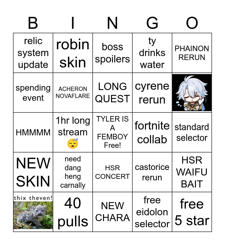 This bingo card has 2 images, a free space and 22 words: need dang heng carnally, LONG QUEST, free eidolon selector, PHAINON RERUN, relic system update, robin skin, boss spoilers, fortnite collab, standard selector, HMMMM, ACHERON NOVAFLARE, castorice rerun, HSR WAIFU BAIT, spending event, 40 pulls, NEW CHARA, ty drinks water, NEW SKIN, 1hr long stream 😴, HSR CONCERT, cyrene rerun and free 5 star.