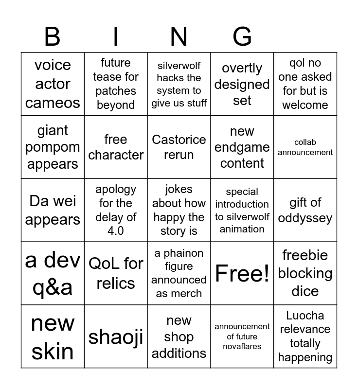 This bingo card has 25 words: QoL for relics, new shop additions, Castorice rerun, new skin, qol no one asked for but is welcome, voice actor cameos, giant pompom appears, future tease for patches beyond, special introduction to silverwolf animation, a phainon figure announced as merch, new endgame content, Da wei appears, Free!, freebie blocking dice, free character, Luocha relevance totally happening, gift of oddyssey, silverwolf hacks the system to give us stuff, collab announcement, apology for the delay of 4.0, jokes about how happy the story is, shaoji, a dev q&a, overtly designed set and announcement of future novaflares.