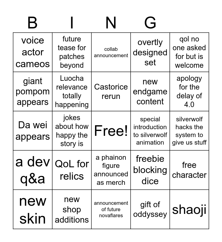 This bingo card has a free space and 24 words: QoL for relics, new shop additions, Castorice rerun, new skin, qol no one asked for but is welcome, voice actor cameos, giant pompom appears, future tease for patches beyond, special introduction to silverwolf animation, a phainon figure announced as merch, new endgame content, Da wei appears, freebie blocking dice, free character, Luocha relevance totally happening, gift of oddyssey, silverwolf hacks the system to give us stuff, collab announcement, apology for the delay of 4.0, jokes about how happy the story is, shaoji, a dev q&a, overtly designed set and announcement of future novaflares.