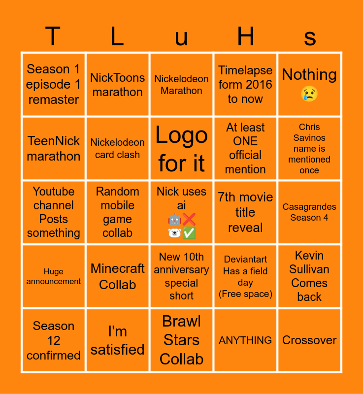 This bingo card has 25 words: Minecraft Collab, Brawl Stars Collab, Logo for it, Season 12 confirmed, Nothing 😢, Season 1 episode 1 remaster, TeenNick marathon, NickToons marathon, 7th movie title reveal, New 10th anniversary special short, At least ONE official mention, Youtube channel Posts something, Deviantart Has a field day (Free space), Kevin Sullivan Comes back, Nickelodeon card clash, Crossover, Casagrandes Season 4, Nickelodeon Marathon, Chris Savinos name is mentioned once, Random mobile game collab, Nick uses ai 🤖❌️ 🐻❄✅️, I'm satisfied, Huge announcement, Timelapse form 2016 to now and ANYTHING.