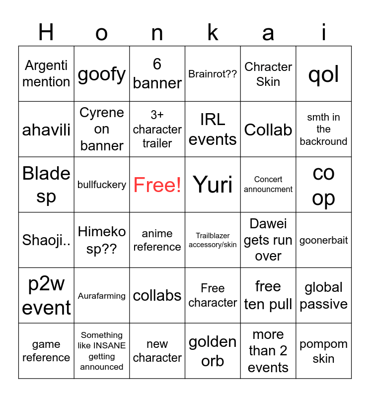 This bingo card has 36 words: Free character, collabs, golden orb, ahavili, Shaoji.., Yuri, Cyrene on banner, new character, Chracter Skin, free ten pull, smth in the backround, Brainrot??, global passive, bullfuckery, IRL events, Argenti mention, p2w event, Concert announcment, Blade sp, 6 banner, Free!, Himeko sp??, Trailblazer accessory/skin, anime reference, Dawei gets run over, goofy, Collab, Something like INSANE getting announced, 3+ character trailer, qol, pompom skin, game reference, goonerbait, co op, Aurafarming and more than 2 events.