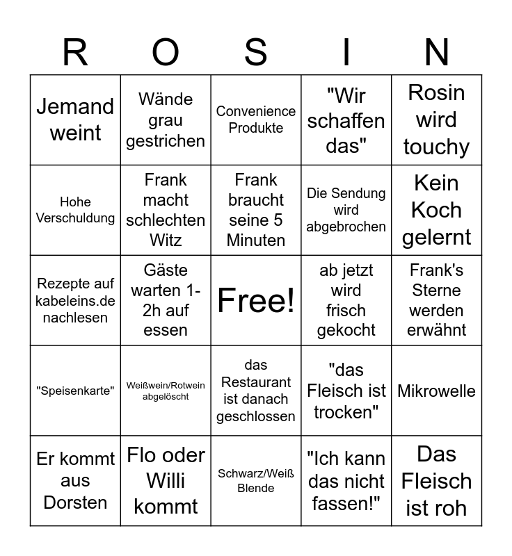 This bingo card has a free space and 24 words: Weißwein/Rotwein abgelöscht, Flo oder Willi kommt, Frank braucht seine 5 Minuten, Er kommt aus Dorsten, Rosin wird touchy, Jemand weint, Hohe Verschuldung, Wände grau gestrichen, ab jetzt wird frisch gekocht, das Restaurant ist danach geschlossen, Die Sendung wird abgebrochen, Rezepte auf kabeleins.de nachlesen, "das Fleisch ist trocken", Mikrowelle, Frank macht schlechten Witz, "Ich kann das nicht fassen!", Frank's Sterne werden erwähnt, Convenience Produkte, Kein Koch gelernt, Gäste warten 1-2h auf essen, Das Fleisch ist roh, "Speisenkarte", "Wir schaffen das" and Schwarz/Weiß Blende.
