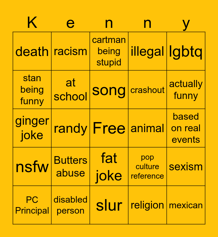 This bingo card has a free space and 24 words: Butters abuse, disabled person, song, PC Principal, lgbtq, death, stan being funny, racism, animal, fat joke, crashout, ginger joke, pop culture reference, sexism, at school, religion, based on real events, cartman being stupid, actually funny, randy, mexican, nsfw, illegal and slur.