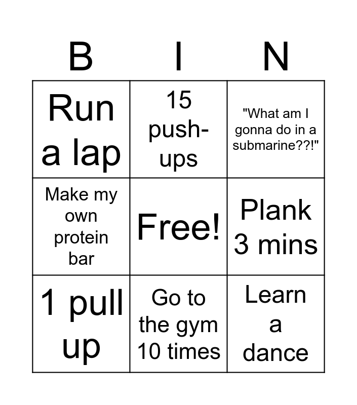 This bingo card has a free space and 8 words: Plank 3 mins, "What am I gonna do in a submarine??!", 15 push-ups, 1 pull up, Run a lap, Learn a dance, Make my own protein bar and Go to the gym 10 times.