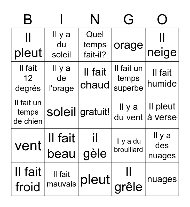 This bingo card has a free space and 24 words: Il fait beau, Il fait mauvais, Il fait chaud, Il fait froid, Il neige, Il pleut, Il fait 12 degrés, Il y a du soleil, Il y a du vent, il gèle, Il fait un temps superbe, Il fait un temps de chien, Il y a du brouillard, Il y a des nuages, Il y a de l'orage, Il grêle, Il pleut à verse, Quel temps fait-il?, Il fait humide, soleil, nuages, vent, orage and pleut.