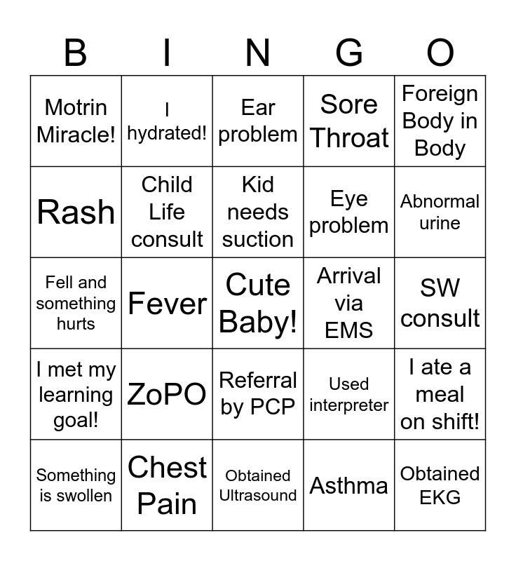 This bingo card has a free space and 24 words: ZoPO, Chest Pain, Kid needs suction, Something is swollen, Foreign Body in Body, Motrin Miracle!, Rash, I hydrated!, Arrival via EMS, Referral by PCP, Eye problem, Fell and something hurts, Used interpreter, I ate a meal on shift!, Child Life consult, Asthma, SW consult, Ear problem, Abnormal urine, Fever, Obtained EKG, I met my learning goal!, Sore Throat and Obtained Ultrasound.