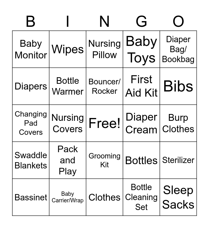 This bingo card has a free space and 24 words: Pack and Play, Baby Carrier/Wrap, Bouncer/ Rocker, Bassinet, Diaper Bag/ Bookbag, Baby Monitor, Diapers, Wipes, Diaper Cream, Grooming Kit, First Aid Kit, Changing Pad Covers, Bottles, Sterilizer, Bottle Warmer, Bottle Cleaning Set, Burp Clothes, Nursing Pillow, Bibs, Nursing Covers, Sleep Sacks, Swaddle Blankets, Baby Toys and Clothes.