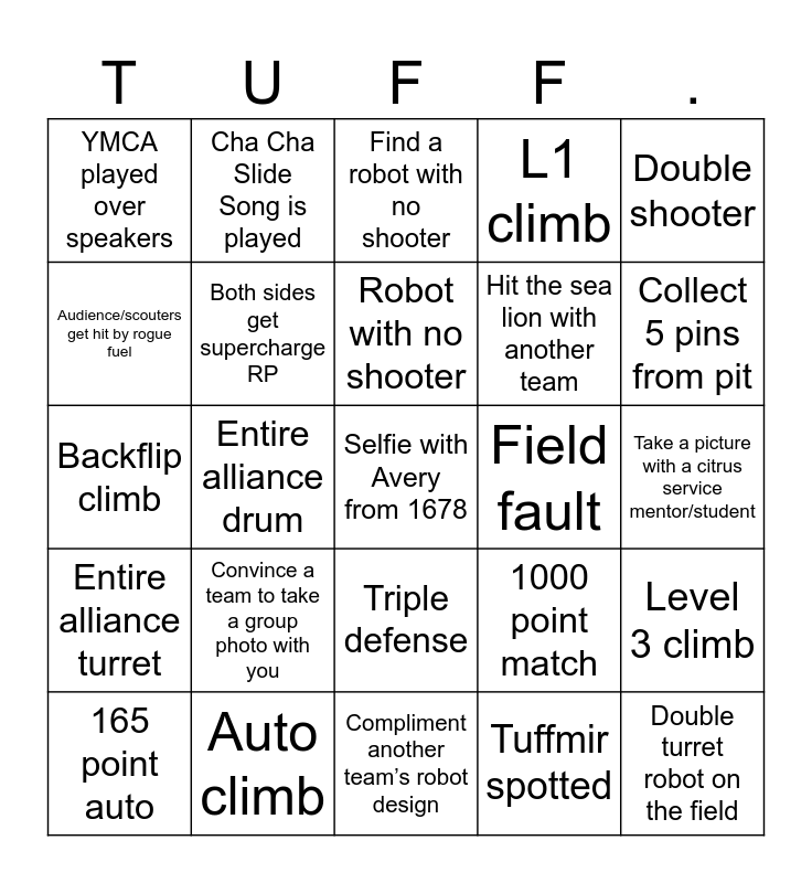 This bingo card has a free space and 35 words: Tom yells your so tuff ___., Kenta gets beached, 800 points combined, Both sides get supercharge RP, Triple defense, L1 climb, Audience/scouters get hit by rogue fuel, Full field herding, Robot with no shooter, Team has dyed hair, Backflip climb, Double shooter, Spindexer, Somebody hits the 67 in a team intro, YMCA played over speakers, Field fault, Tuffmir spotted, Entire alliance drum, Entire alliance turret, Double turret robot on the field, 1000 point match, 165 point auto, Level 3 climb, Auto climb, Find a robot with no shooter, Collect 5 pins from pit, Get a signature from each media person, Get a picture with a mascot, Hit the sea lion with another team, Take a picture with a citrus service mentor/student, Take a picture with a cheezy care mentor/student, Compliment another team’s robot design, Convince a team to take a group photo with you, Cha Cha Slide Song is played and Team that got taco bell for lunch/dinner.