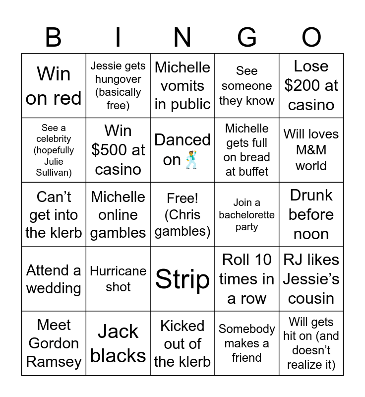 This bingo card has a free space and 24 words: Hurricane shot, Jack blacks, Danced on🕺, Meet Gordon Ramsey, Lose $200 at casino, Win on red, See a celebrity (hopefully Julie Sullivan), Jessie gets hungover (basically free), Join a bachelorette party, Strip, Michelle gets full on bread at buffet, Can’t get into the klerb, Roll 10 times in a row, RJ likes Jessie’s cousin, Win $500 at casino, Somebody makes a friend, Drunk before noon, Michelle vomits in public, Will loves M&M world, Michelle online gambles, Will gets hit on (and doesn’t realize it), Attend a wedding, See someone they know and Kicked out of the klerb.